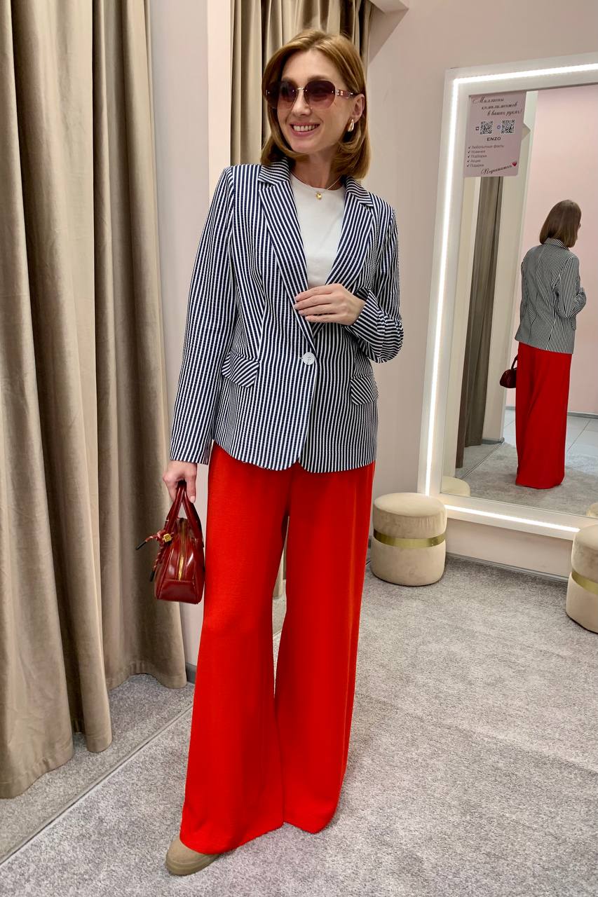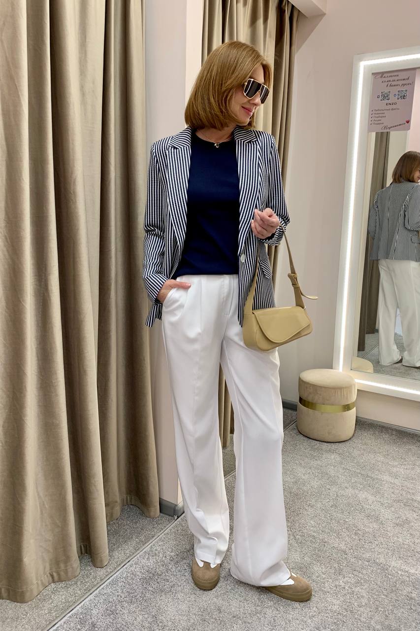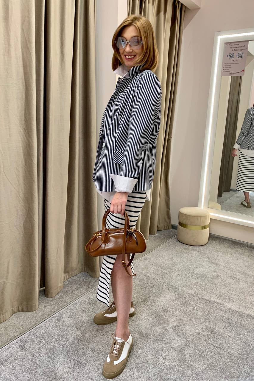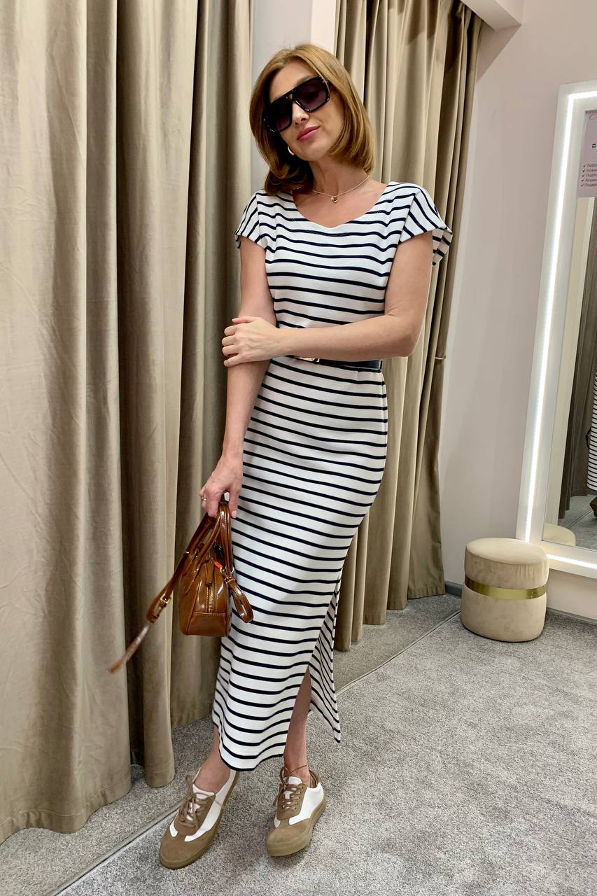 Жакет в полоску будет идеален в сочетании как с любыми однотонными брюками, так и с базовыми джинсами. Дополняем капсулу платьем длины макси — мини-капсула готова!