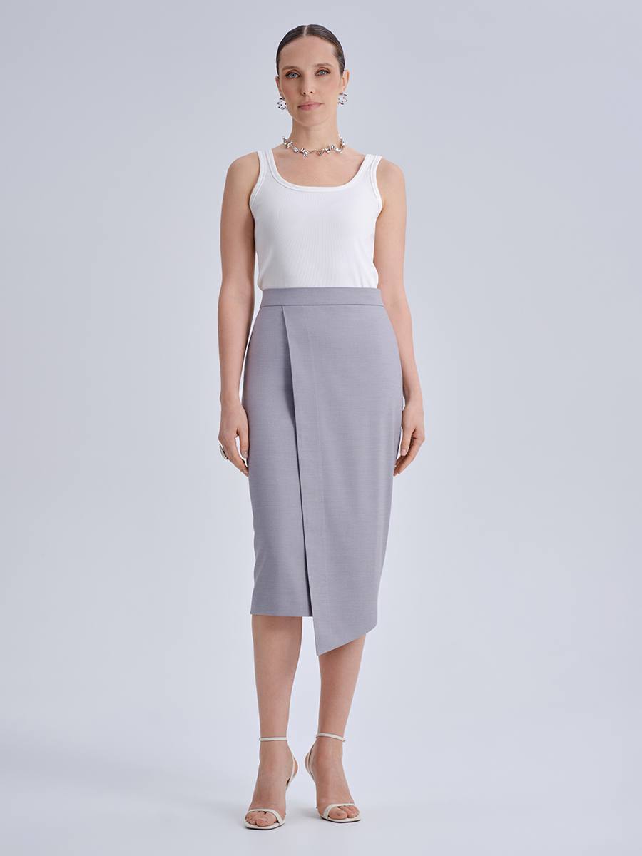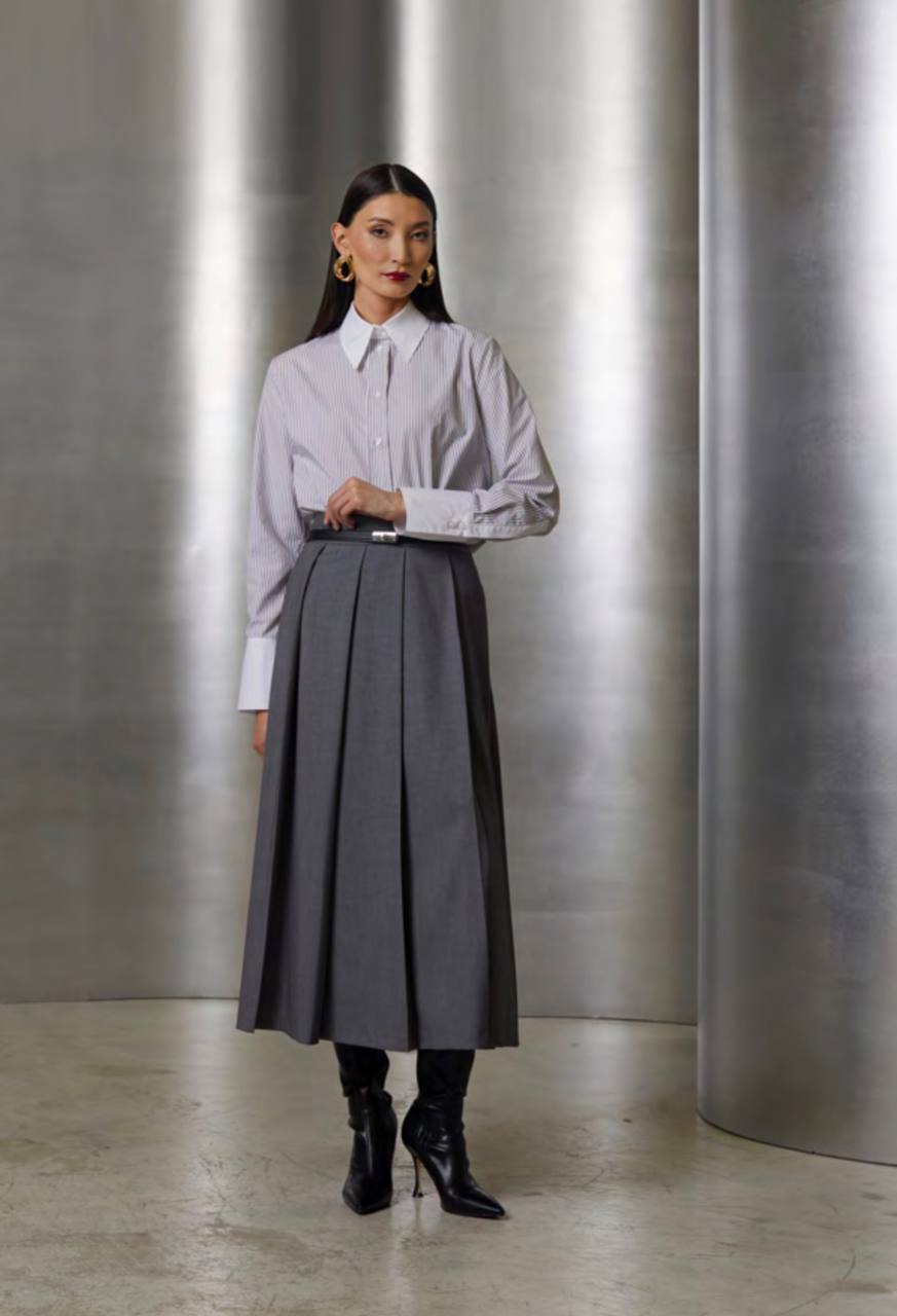 Например, выбирайте юбки из плотных тканей — твид, шерсть, деним. Они держат форму и реально спасают от ветра. А еще отлично работают многослойные комбинации, например, юбка + высокие сапоги + длинное пальто.
