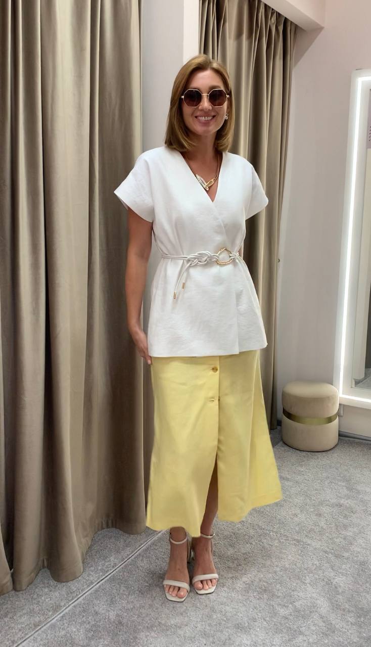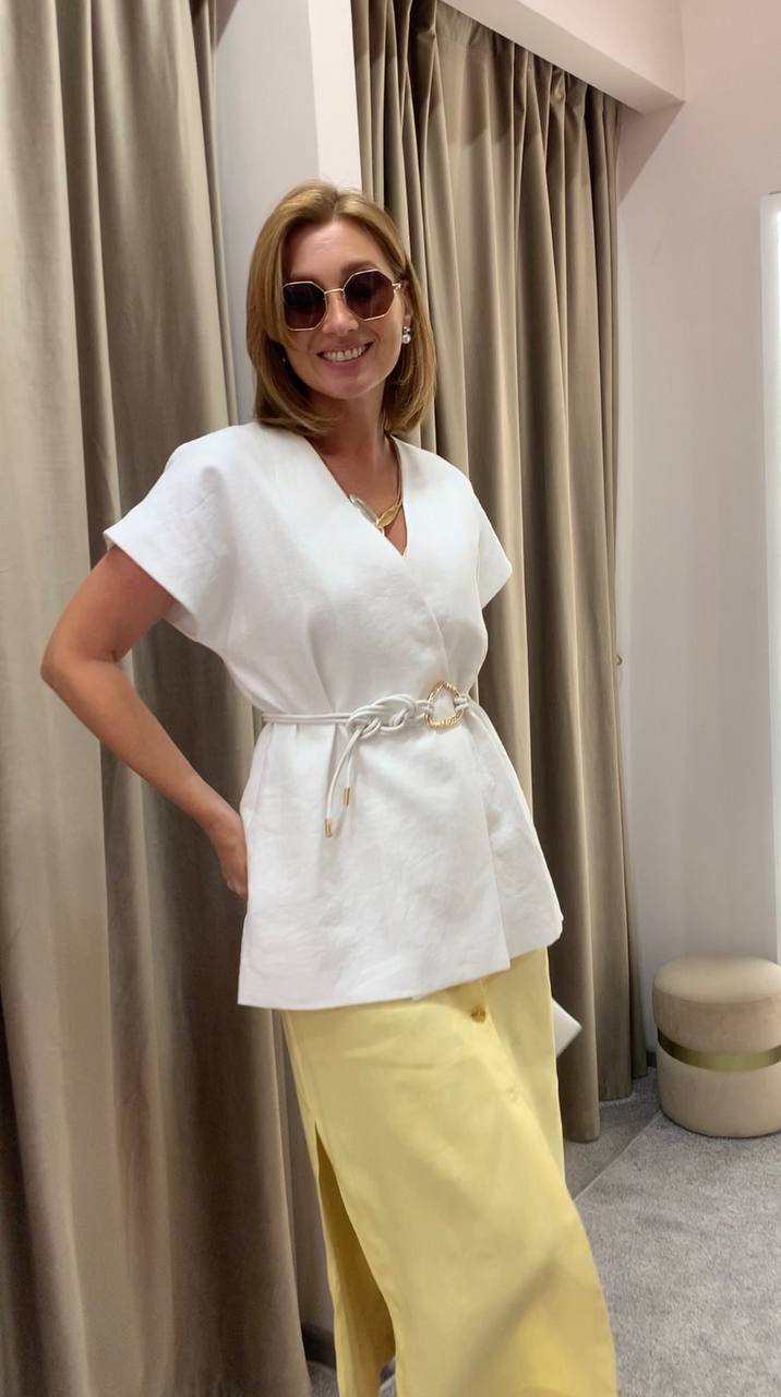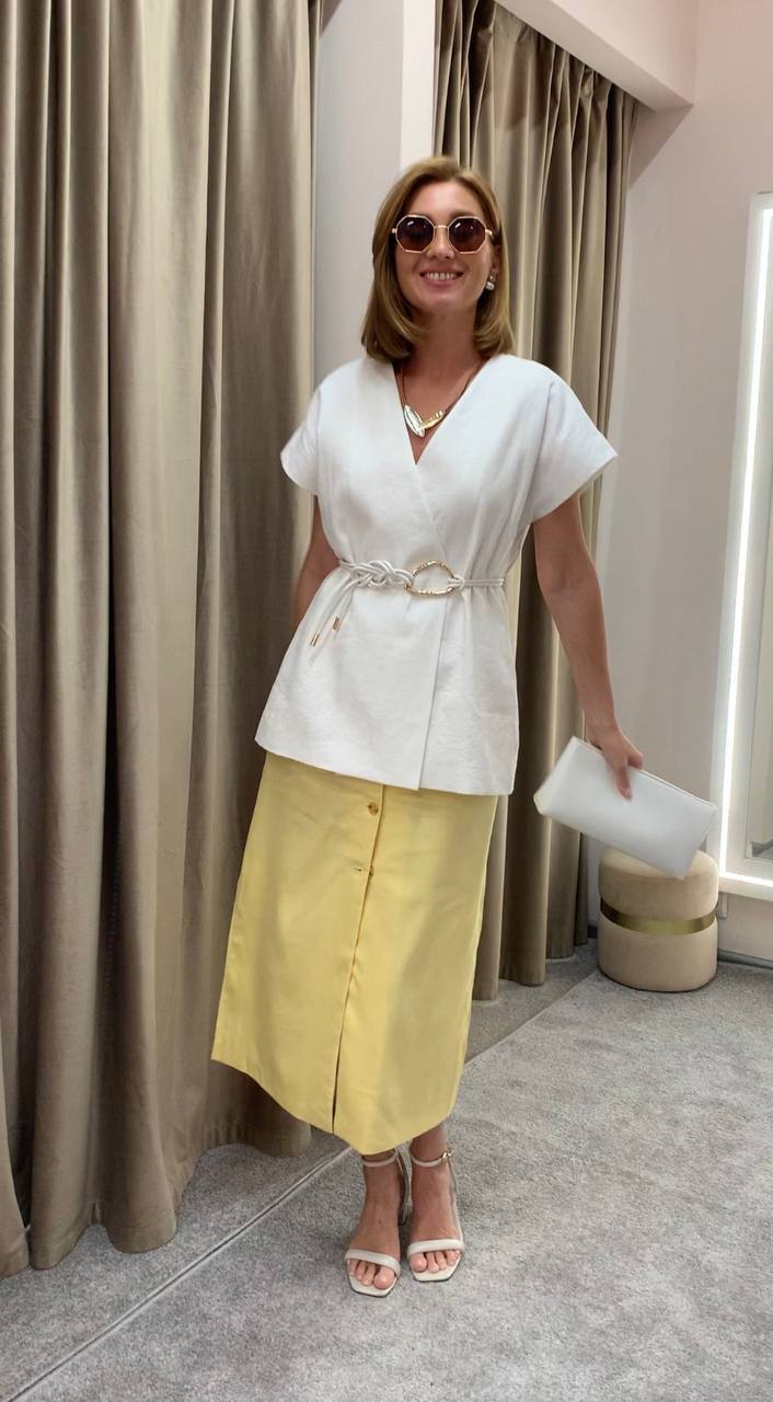 📌Универсальный совет в сочетании белого: если белый цвет имеет холодный подтон, то следует сочетать с холодными оттенками, если теплый — с теплыми. Светлый, солнечный желтый оттенок идеален в комбинации с белым, имеющим теплый подтон. По этой же причине для большей гармонии дополняем образ золотистыми аксессуарами, так гармонично подходящим к желтому цвету✨