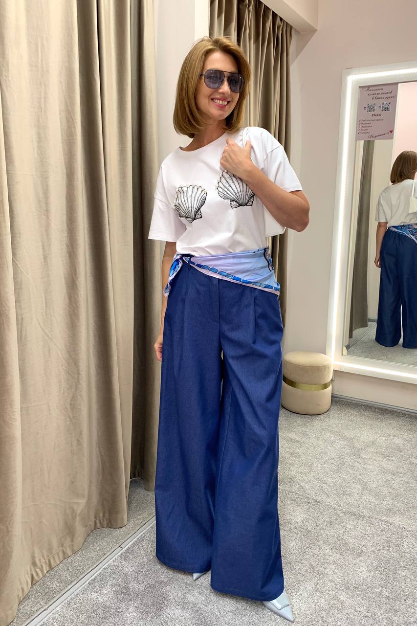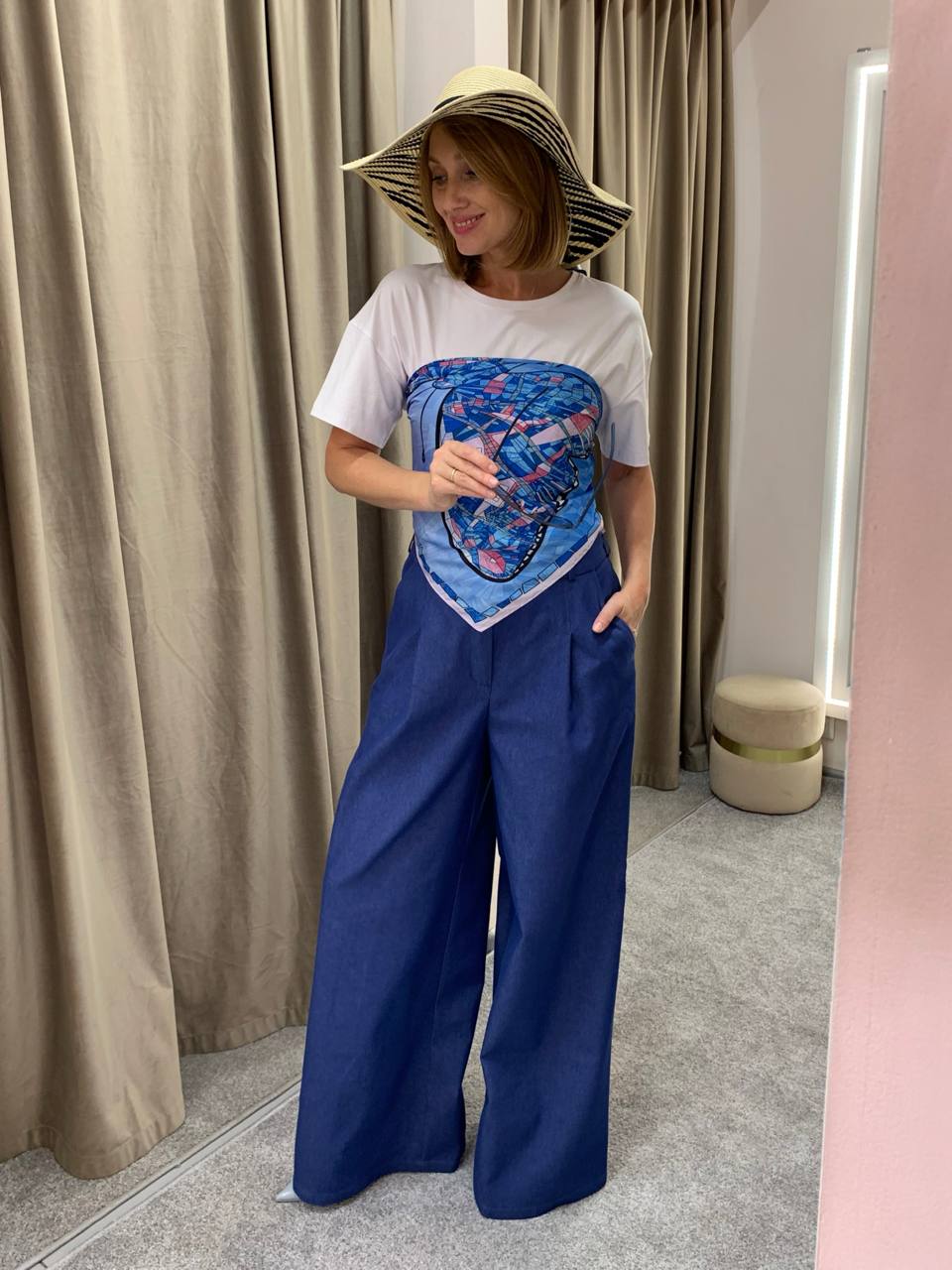 Топ из платка из круизной серии перекочевал в обыденную — его можно надеть даже на работу, накинув поверх жакет или рубашку. В топе из платка можно отправиться на прогулку в жаркий летний день или встретиться с подругами в баре за коктейлем. Образы будут смотреться необычно, игриво, строгость можно регулировать через принт и манеру исполнения: в данном случае наш стилист использует платок как легкий акцент, показывая как вписать его в современные образы, без лишнего оголения и страха потерять «верх»