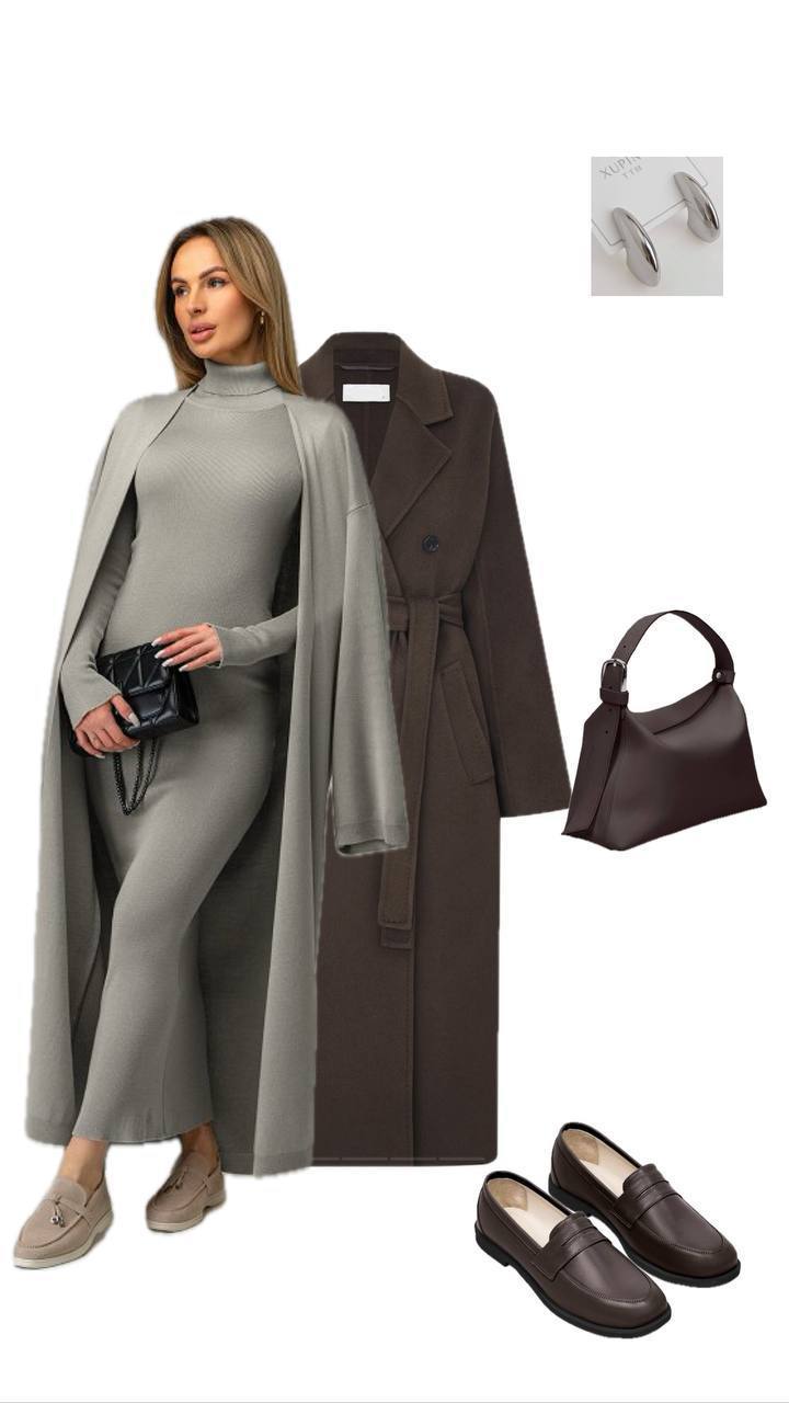 🔟Лаконичное трикотажное платье с кардиганом + замшевые лоферы и сумка из лимитированной коллекции + пальто