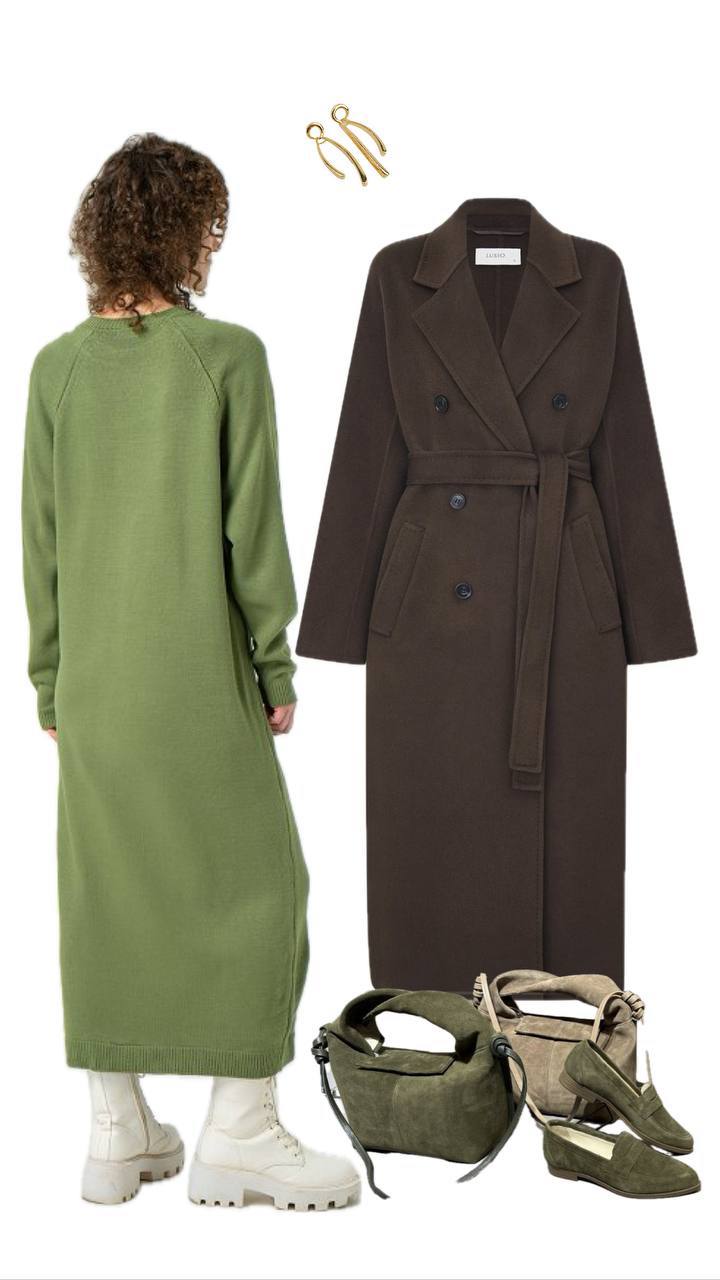 1️⃣Платье в трендовом зелёном цвете + кожаные лоферы и сумка из лимитированной коллекции + пальто